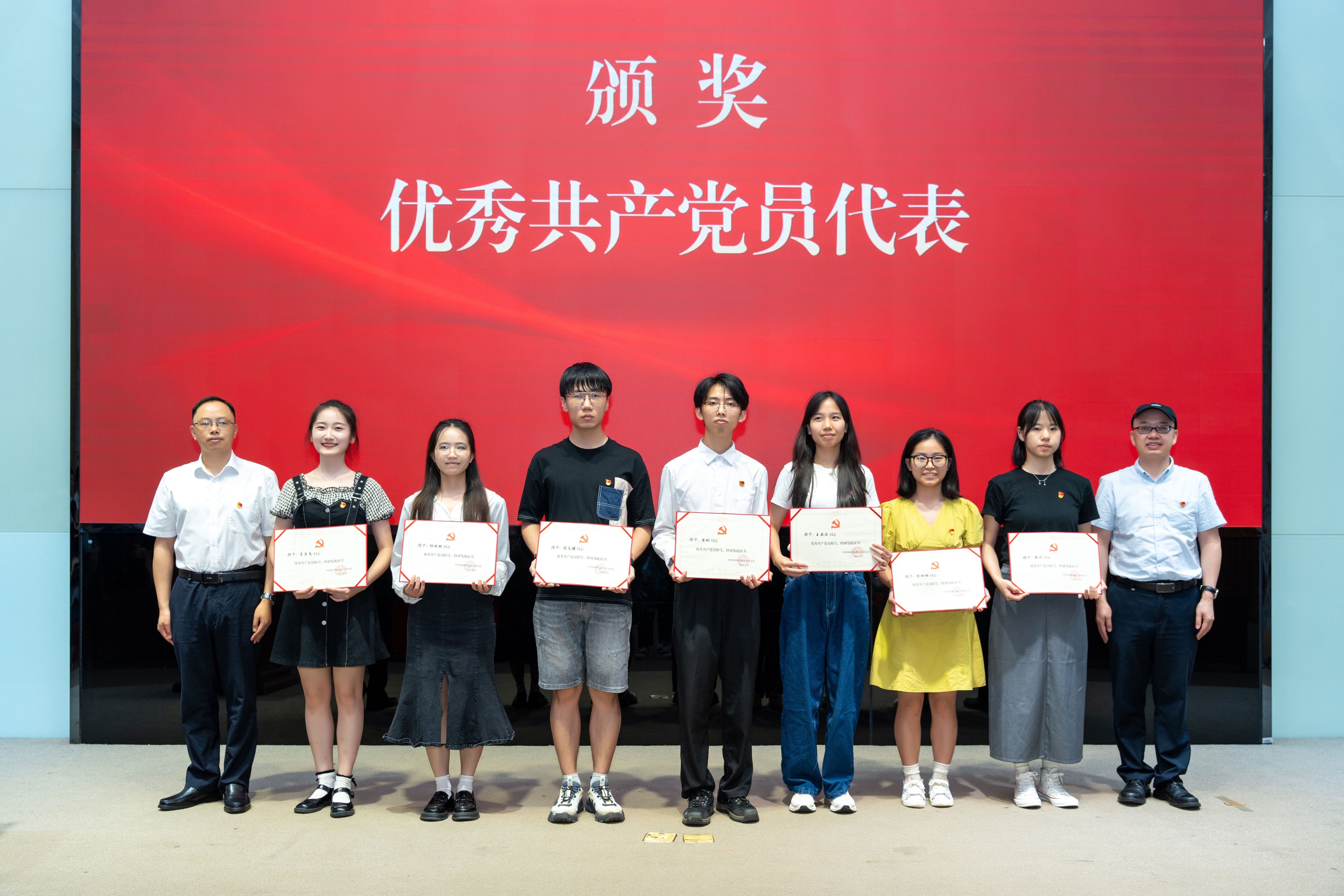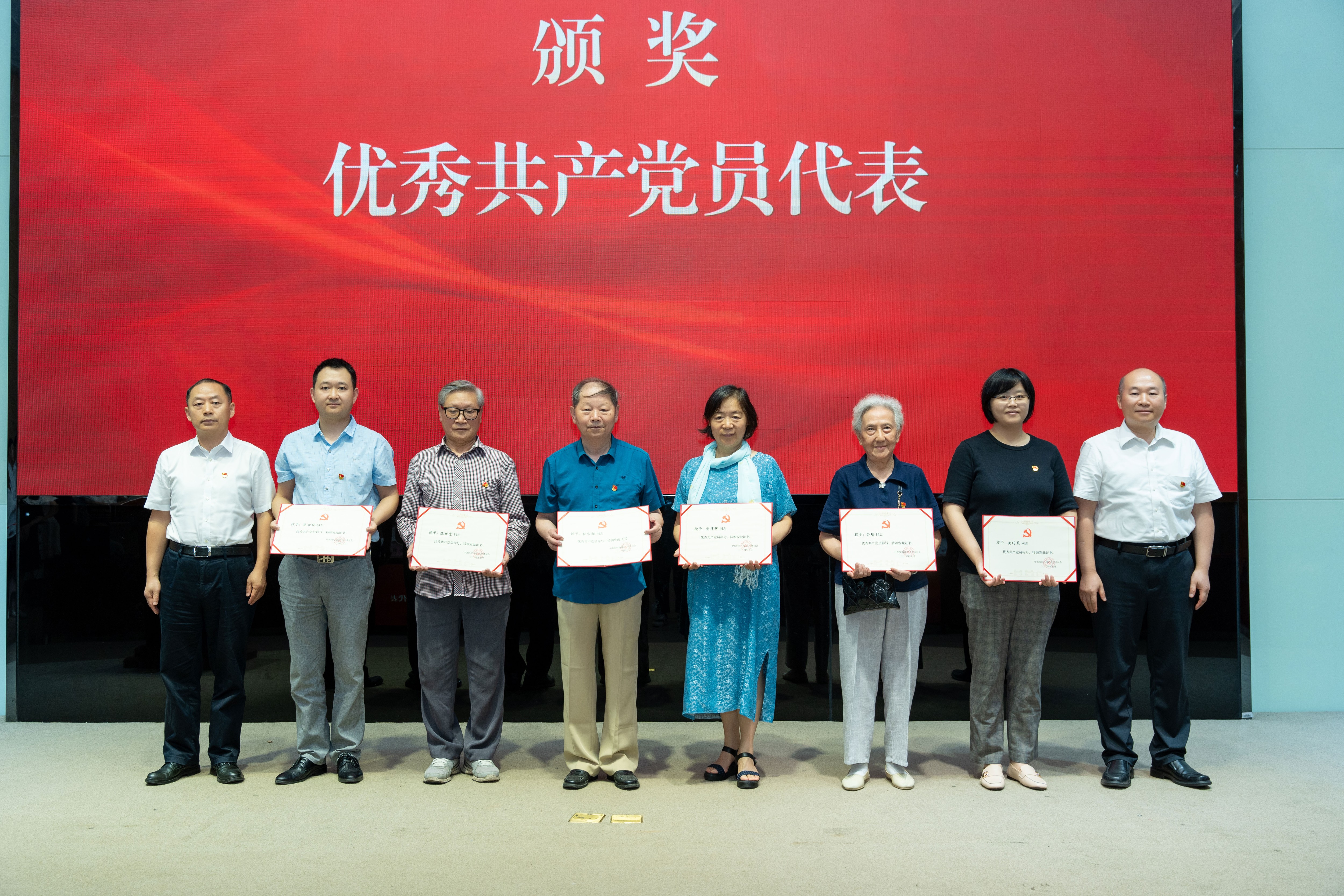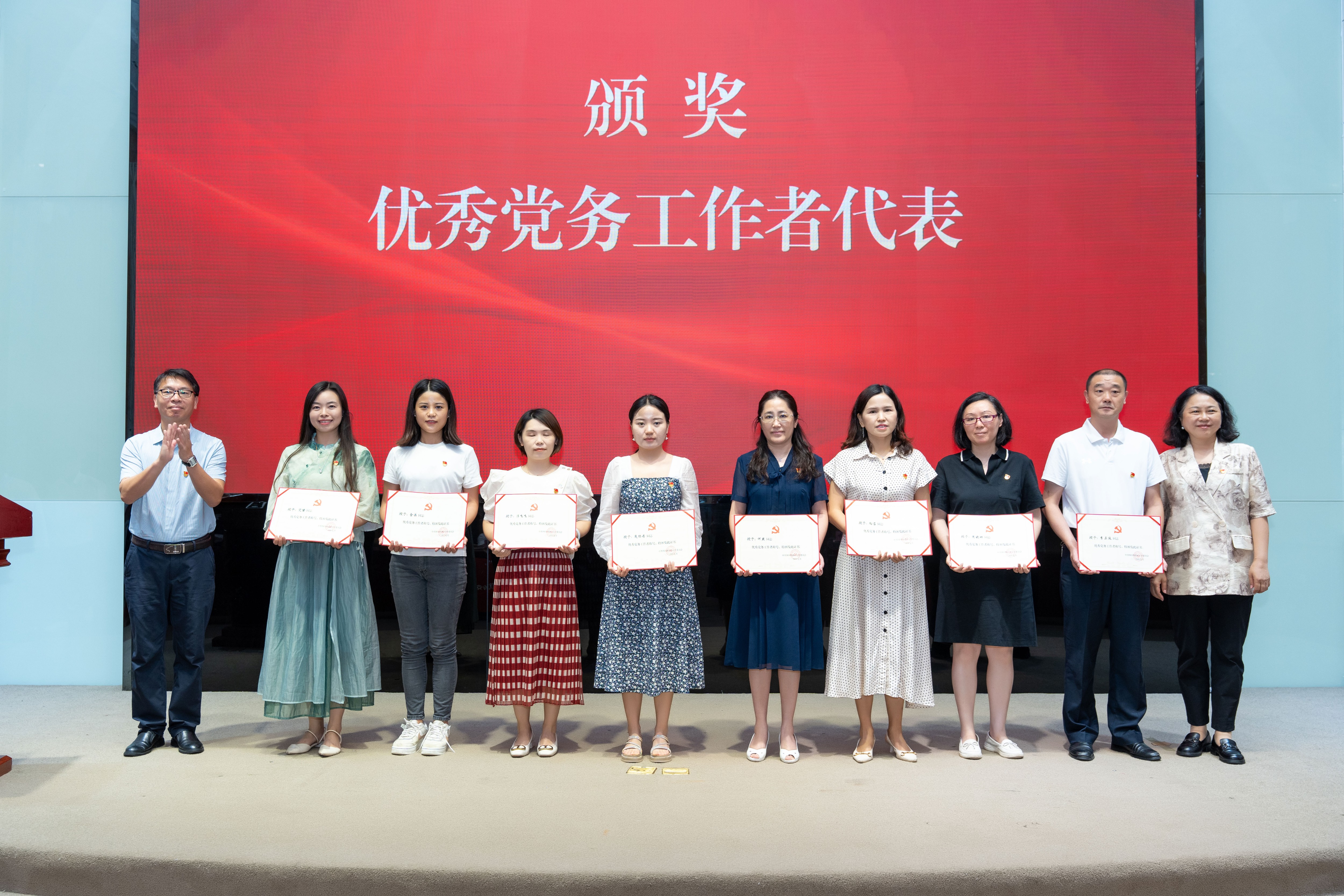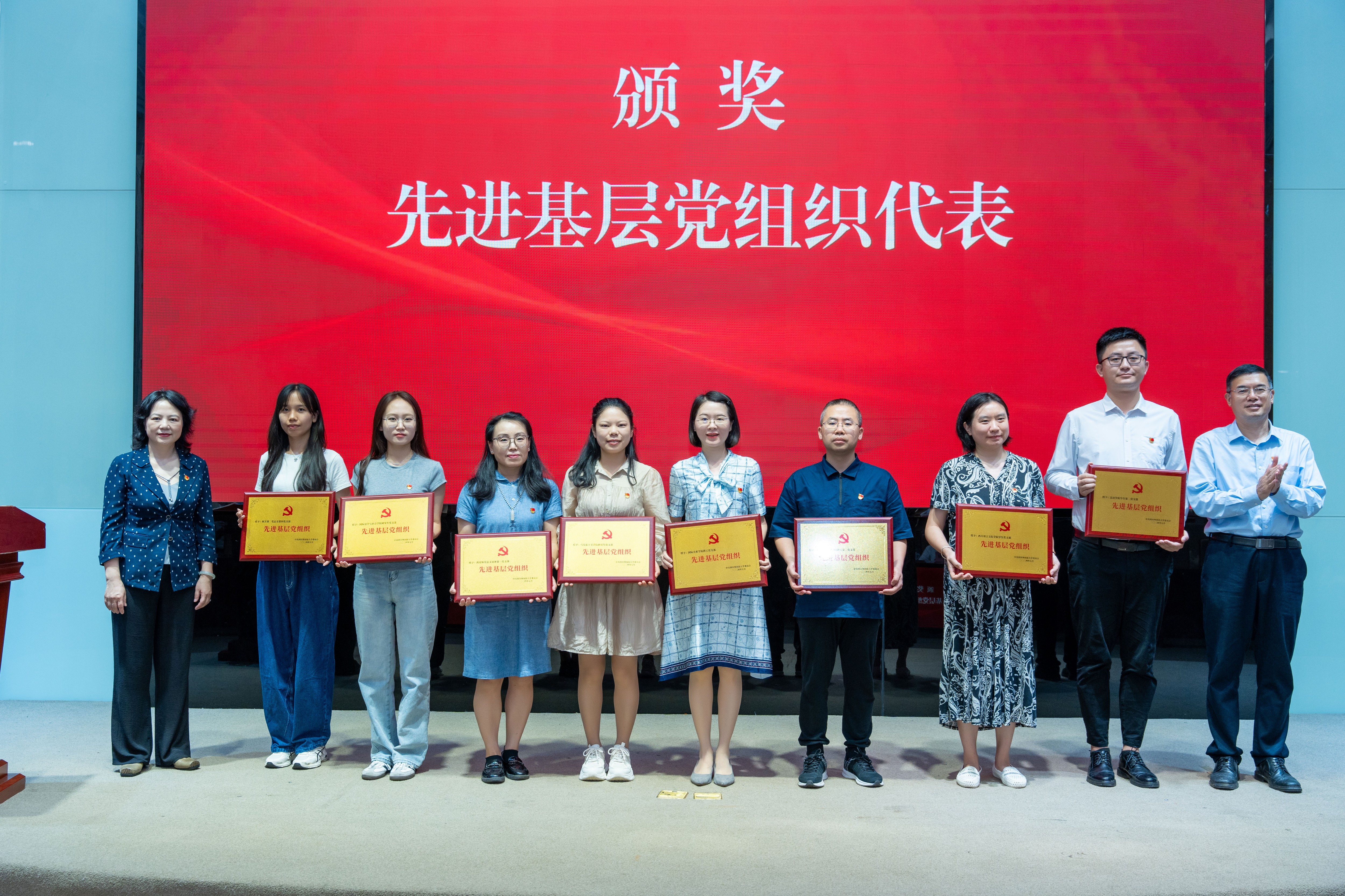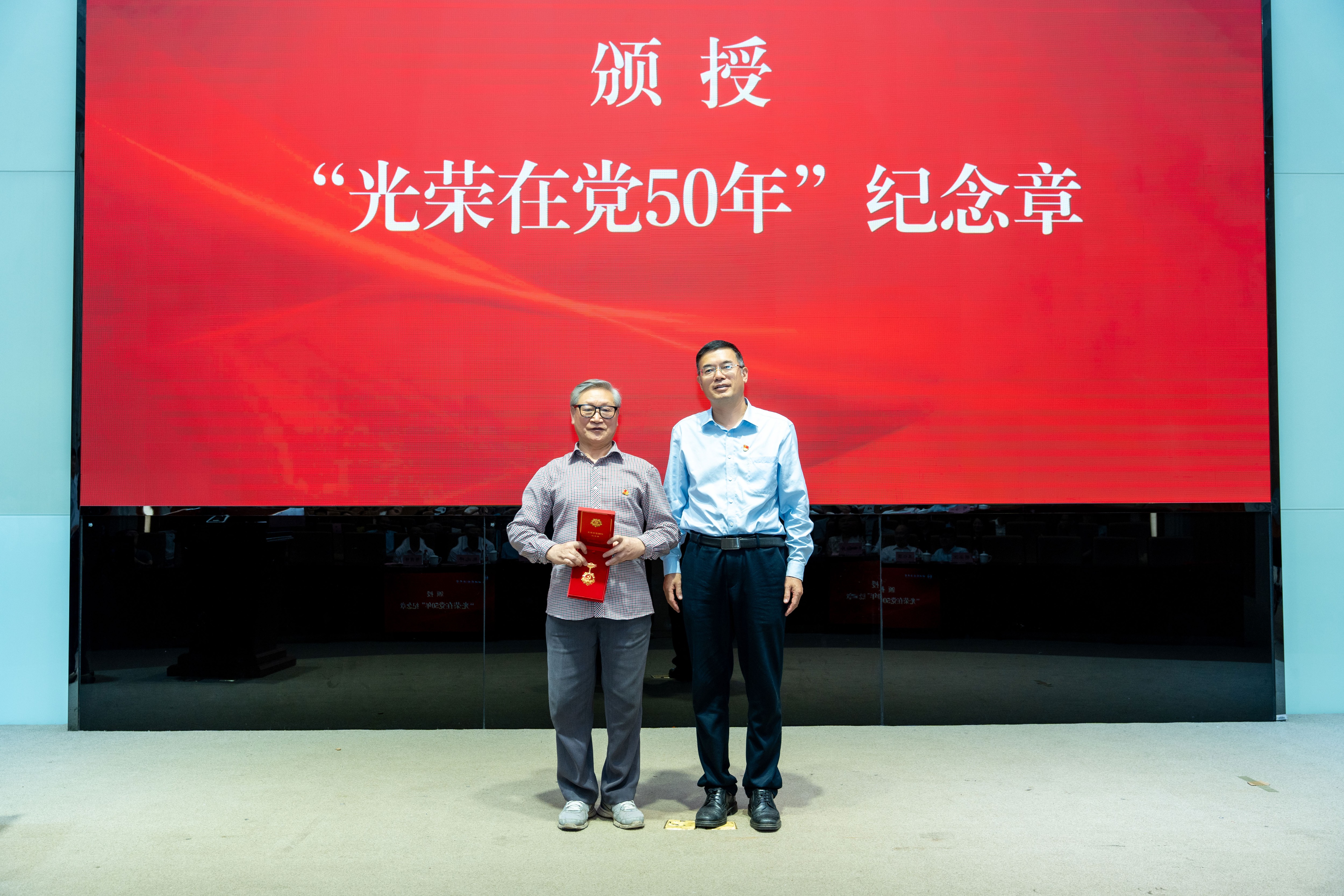 颁发“光荣在党50年”纪念章环节,党委书记邹渝为纪念章获得者亲友代表颁发“光荣在党50年”纪念章。在“两优一先”颁奖环节,校领导依次为优秀共产党员学生代表、优秀共产党员教职工代表、优秀党务工作者代表、先进基层党组织代表颁奖。