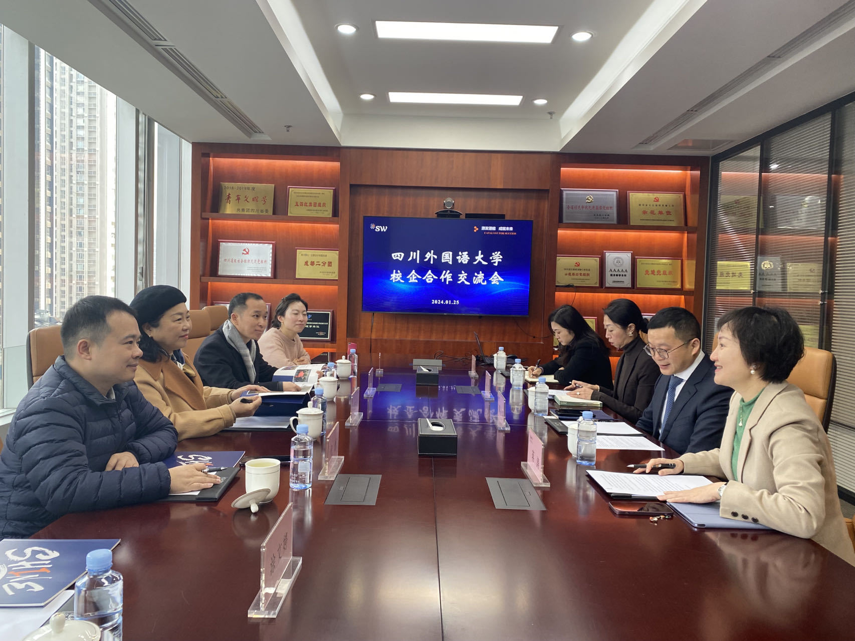 在访企拓岗的第二站,郑白玲副校长一行走访了信永中和会计师事务所成都分所,与合伙人陈洪涛、张凌,人力资源总监蒋涛等进行了深入交流。信永中和会计师事务所是目前国内最具声望、最具规模的会计师事务所之一,近几年川外学生在信永中和的实习就业人数不断增加,校企合作情谊持续加深。陈洪涛合伙人详细介绍了信永中和历史沿革、文化理念、组织架构以及在“国际化、一体化、数字化、高端化”等方面的独特亮点和优势,表示信永中和致力于成为一家具有国际影响力的世界一流专业服务机构,期待与川外进一步加强合作共同培养更加契合企业发展需求的优秀人才。郑白玲副校长肯定了校企双方前期合作成效,认为川外学科专业与信永中和的业务板块十分契合,希望双方紧密合作,优势互补,围绕“数字化、国际化”,在实习实训基地、师资队伍、课程开发、人才培养模式改革、学术研讨以及校企党支部共建等方面开展全方位合作,共同培养高素质国际化财经人才,为区域经济社会高质量发展赋能助力。