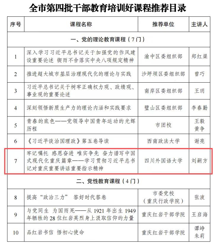 为坚持不懈用习近平新时代中国特色社会主义思想凝心铸魂,构建富有时代特征和实践特色、务实管用的干部教育培训课程体系,推进优质培训资源共享,根据《2025年全市干部教育培训重点工作》安排,市委组织部开展了全市第四批干部教育培训好课程推荐评选工作。12月26日,市委组织部印发了全市第四批干部教育培训好课程推荐目录,确定20门课程为全市第四批干部教育培训好课程,我校报送的由党委书记刘嗣方讲授的《牢记嘱托 感恩奋进 唯实争先 奋力谱写中国式现代化重庆篇章——学习贯彻习近平总书记对重庆重要讲话重要指示精神》课程成功入选。
