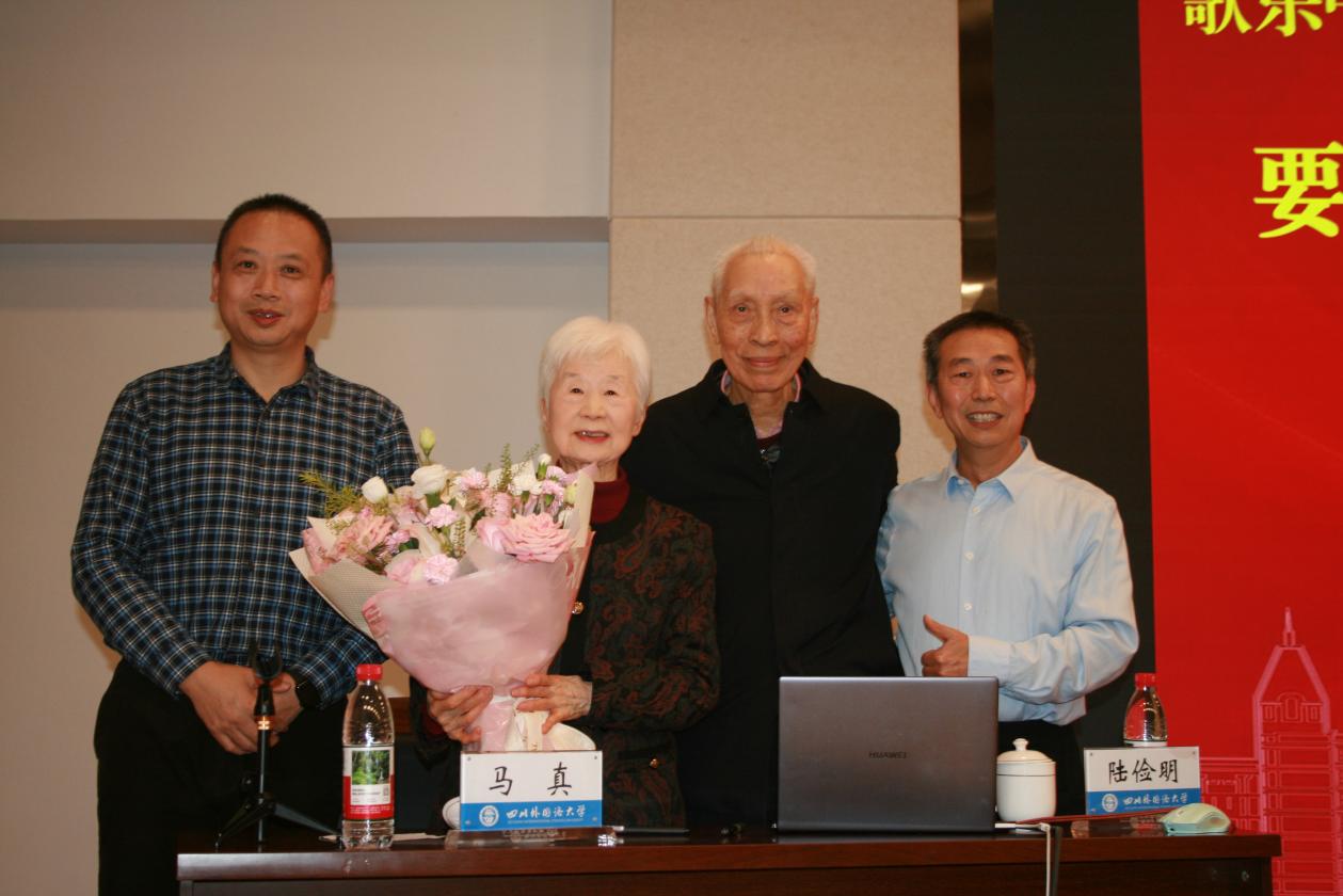讲座尾声,中国语言文化学院院长胡登全教授代表全体师生向马真教授献花,致以衷心感谢。全体师生与马真教授、陆俭明教授合影留念,讲座在热烈的氛围中圆满结束。